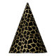 This party hat is shown with a fun giraffe print in black and gold colorings.