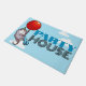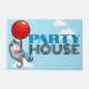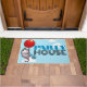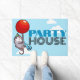 Welcome your party guests at the door with this doormat, featuring a cute opossom in a striped party hat, floating by on a big red balloon while blowing a star spangled party blower. Use "Personalize this template" to change the "PARTY HOUSE" text if desired