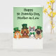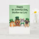 Designed with four friendly, human-like pets peeking over a bright white fence, this St. Patrick’s Day scene feels like a group of close pals leaning in for a photo 💚. On the left is an orange-striped cat, beside a brown long-eared dog with a pink tongue showing, followed by a gray-striped cat, and a small fawn-colored dog with a short snout. Each one wears an emerald-green top hat, and the gray cat adds a matching green bow tie that hints at a sweet, admiring bond with the others. Their wide eyes and soft smiles meet you head-on, like they’re sharing a private joke and inviting you into the moment. The background fades through gentle shades of green, keeping the focus on their faces and hats ☘️. Near the top, a dark green holiday greeting is set in large letters, centered above the characters. The white fence runs straight across the lower portion, with the four hats and heads lined up evenly against the green gradient.