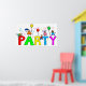 Happy and diverse group of kids climbing over the word PARTY.