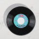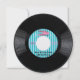 Round pearl shimmer invitation with an image of a 45 rpm record with a 50s-style blue-stripe record label. The record label reads "Party Time." Song title is "Bop 'Til You Drop (At My Party).” The back has a washed out version of the record. See matching envelope, confetti, favor bag, favor tag and sticker. See the entire Nifty 50s Invitation collection in the INVITES | Invitations section.