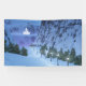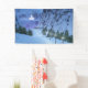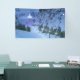 The sparkling snow-covered path is hemmed in by dark fir trees. On the far side of the cleft a translucent glowing fairy castle awaits the enchanted traveler on his journey to fairyland.