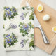 Kitchen dish towel design with passionflowers and stems of purple lavender. This pretty floral pattern combines two favorite light purple flowers on an ecru background. Other colors are periwinkle blue, green, and yellow. Design is printed on one side only.