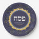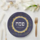 Set a stunning ( and worry-free!) Passover Seder Table with our beautiful, festive Jerusalem Swirl Jerusalem Paper plates in Navy. Hebrew Text Reads Passover. Add your family name.