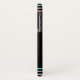 Stylish black iPhone case, with graphic artwork of a pastel abstract dragonfly and teal, pink and blush line borders, on the top and bottom. Personalize the teal colored text for a very special gift idea for her.
