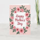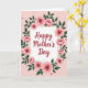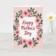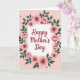 At the center of the card is a bright white rectangular panel with a thin gold outline, giving the layout a gentle, polished look. Across the middle of that panel, the words “Happy Mother’s Day” appear in flowing crimson lettering, standing out clearly against the white space. Surrounding the panel is a full floral garland of soft pink blossoms, each with a deeper rosy center that adds depth and a tender, affectionate mood ❤️. Deep green leaves weave between the flowers, and the softly painted texture makes the petals look cushioned and layered, like they’re leaning in close together. Behind everything sits a blush-pink background that keeps the scene calm and sweet, like a quiet moment shared between loved ones 👩. Small burgundy dots are scattered around the background, adding tiny accents without distracting from the main message. The flowers and leaves form an even frame around the central panel, guiding your eye back to the crimson text. The blush backdrop is sprinkled with evenly spaced burgundy dots around the floral border and the gold-edged white panel.