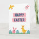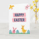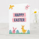 Designed with soft pastel pink banners at the center, this card features a friendly spring greeting in rounded, sans-serif letters set in a darker contrasting tone for easy reading. Around the text, a bright yellow little bird glides in from the upper left, its open wings angled as if it’s circling back toward a floating pink bunny 🐇 in the upper right. Their positions create a gentle, almost flirty back-and-forth, like two friends meeting midair. Along the bottom, a band of fresh green grass adds a grounded base, dotted with decorated egg shapes in light blue and other spring colors 🌷. A round pink bunny peeks from behind a striped blue egg, giving the scene a coy, affectionate touch. Nearby, a small yellow bird with long, pointed ear-like feathers stands close to another patterned egg, as if keeping watch for its companion. The background stays bright white, letting the pinks, yellows, greens, and blues stand out, with the striped blue egg sitting just left of center near the grass line.