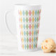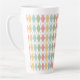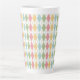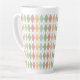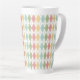 Modern and stylish latte mug has pastel colored argyle diamond pattern on white background.