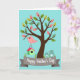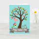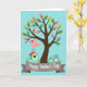 This greeting card shows a sky-blue background with a stylized tree in the center, featuring a sturdy brown trunk and rounded leaves in soft pink, light green, and muted sage. Near an upper branch, a rosy-pink bird with a round eye and small crest sits close to a hanging birdhouse, as if keeping watch with a gentle, caring gaze ❤️. The birdhouse is mint green with a coral-red roof, suspended from the branch like a cozy little home. At the base of the tree, two rounded blue birds stand close together, their orange beaks angled toward each other in a quiet, affectionate moment that reads like family closeness or friendship 🌼. A gray ribbon-like banner stretches across the lower area, and the message appears centered on it in white lettering. The shapes stay flat and simple with no heavy shading, giving the scene a calm, storybook feel. The banner looks slightly curled at the ends, sitting just below the birds and in front of the tree trunk.