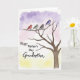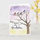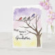 On the front of the card a watercolor-style tree fills the right side, with dark brown branches reaching outward like an open arm. Four small birds sit close together on one branch, leaning in as if sharing a private, affectionate moment ❤️. Each bird is a different soft shade—reddish orange, sage green, gentle taupe, and periwinkle blue—outlined neatly so their shapes feel crisp against the wash. The background fades from lavender at the top into pale pink across the middle and then into warm yellow near the bottom, like early light spreading across the sky. On the left side, the message “Happy Mother’s Day Grandmother” is placed in dark flowing lettering that stands out clearly over the lighter colors. The spacing leaves plenty of breathing room between the words and the tree, keeping the scene calm and easy to take in 🌼. Fine watercolor texture is visible throughout, especially where the purple blends into the pink behind the text.