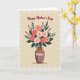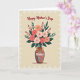 This card shows a full bouquet of stylized flowers arranged like a loving embrace, with layered petals in soft pink, coral, and deep rose nestled among emerald leaves and thin reddish sprigs ❤️. The blooms sit in a glossy vase with swirling tones of blue, purple, and warm fuchsia that feel like a gentle glow in a quiet room. A golden ribbon is tied into a neat bow around the vase neck, adding a small, affectionate touch like a gift carefully prepared. Near the top, the words “Happy Mother’s Day” are placed above the bouquet in bright red, flowing lettering that stands out against the light background. On the vase, the word “Mother” appears in white, centered and easy to spot, as if softly spoken. A delicate white lace-like border frames the whole scene, giving it an old-fashioned, keepsake look 🌼. Behind everything, the background is creamy with a subtle fade toward a soft yellow center, and the border’s fine loops and scalloped details trace the edges.