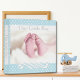 Pastel blue polka-dots pattern background with cute, babies feet. White ribbon at top and spine with *customizable titles. White centered emblem at bottom and white clipart feet on reverse side. *Template at right for your convenience.