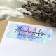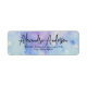 Modern personalized return address label design featuring a pastel blue/purple watercolor background with your name written in a modern script. The text is fully customizable.