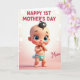 This card shows a sweet baby-like character with oversized blue eyes, rosy cheeks, and a small curl of dark hair, standing front and center as if leaning in with friendly affection ❤️. The background is a soft pastel pink with a gentle, hazy glow and scattered light dots that feel like a dreamy celebration. The little figure wears a seafoam green diaper with white scalloped edging, a centered button, and a fluffy white tail detail that adds a cozy, cuddly look. One tiny hand rests near the chin, giving the pose a shy, tender charm, like a quiet moment shared with someone close. Near the top, the message “HAPPY 1ST MOTHER’S DAY” appears in bright fuchsia, set in thick, easy-to-read lettering. In the lower right, the word “Mum” is written smaller in a flowing style, also in a pink tone, adding a gentle, affectionate note 🌼. The lighting creates soft highlights on the smooth skin and a faint shadow under the character’s feet on the pink ground. A fluffy white pom-pom tail sits at the back of the diaper, standing out against the green fabric.