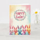 This card shows a soft spring scene with five stylized bunny figures lined up along the lower edge, each in a gentle pastel shade of white, orange, blue, pink, and yellow 🐰. Their big, shiny eyes and small smiles feel like they’re sharing a friendly secret, and their long ears tilt in slightly different directions as if they’re leaning toward one another. In front of them, partially overlapping their bodies, sit decorated eggs with simple polka dots and stripes that add a sweet holiday touch. Near the top center, the words “HAPPY Easter!” appear in a flowing, rounded lettering style, with “HAPPY” set above “Easter!” in a darker, easy-to-read color. A thin wreath of leaves and tiny berries circles the greeting, giving it a gentle frame like a spring garland 🌷. Behind everything, the background fades from a creamy white center into soft watercolor-like clouds of warm yellow, blush pink, and pale blue around the edges. The wreath is made up of small green leaves with a few berry accents, forming an airy ring around the text.