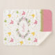 Add a beautiful touch of springtime to your home bedroom decor with this butterfly floral sherpa blanket. Blanket has a pattern of pastel pink, yellow, and green butterflies and polka dots. In the center there's a place for your custom text, such as a first name, in the middle of a wreath of flowers.