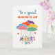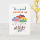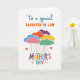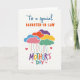 This card features a bright illustration on a white background, with layered lettering and a sweet, affectionate mood ❤️. Near the top, a flowing blue line of text sits centered like a gentle greeting, and just beneath it an orange line in a simple, easy-to-read style calls out a family relationship. In the middle, six rounded cloud shapes cluster together like friends leaning in close, each filled with a mix of pink, blue, orange, purple, yellow, and green. Thin, multicolored lines fall from the clouds like soft rain, creating a tender, connected look as the colors travel downward together. The main message appears below in large, cheerful letters, with each character tinted a different shade to match the clouds above. Small red hearts are sprinkled between a few of the falling lines and around the lower words, adding a romantic touch without crowding the layout 🌼. The bottom area keeps plenty of open space so the colorful text stands out clearly, and the little crimson hearts sit near the last line of lettering.