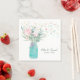 Pretty and a bit whimsical is this modern floral wedding paper napkin, which features a blue green mason jar holding pale pink and white flowers with soft teal greenery. A background of pastel pink and blue confetti combines with gold flecks to add interest and contrast to the delicate flowers. Your custom text is in teal at the bottom right. Be sure to see the matching wedding products, including invitations, in our store. *This design uses artwork from LABFcreations on Etsy.
