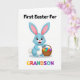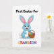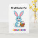 This card features a pastel-blue long-eared bunny centered on a white background, with soft pink inside the ears and a tiny pink nose, smiling with bright eyes and small lashes 🐰. Its rounded, cuddly shape and fluffy white tail add a sweet, affectionate look, like it’s posing proudly for someone it adores. In one paw, it holds a woven basket that tips slightly forward, showing off decorated eggs in red, yellow, green with stripes, deep blue, and purple with stripes. Near the top, the phrase “First Easter For” sits in black lettering, spaced neatly above the character. Along the bottom, “GRANDSON” appears in individual rainbow-colored letters, each one a different hue to create a cheerful row. The gentle shading and smooth color transitions give the scene a soft springtime feel, with the bunny’s friendly expression suggesting a tender family bond 🌷. The basket handle arcs over the eggs, and the striped patterns are crisp against the bright white space.