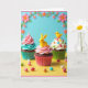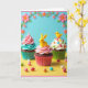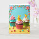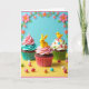 This greeting card features three decorated cupcakes set on a sunny yellow tabletop, arranged on a gentle diagonal that feels like friends leaning in for a photo. Each chocolate-brown cake sits in a bright liner—teal, coral pink, and lime green—while the frosting forms soft swirls in teal and two shades of rose pink. The center cupcake has pink frosting topped with a tiny yellow bunny 🐰, angled as if it’s looking over at the neighboring treat with a tender, companionable tilt. On the right, a white-frosted cupcake is sprinkled with small round candies in mixed colors and finished with a little yellow bird perched on top. The third cupcake shows a two-tone swirl of teal and pink, echoing the sweet back-and-forth of a shared dessert date. Scattered around the base are pastel egg-shaped candies, and the background is a gentle sky blue with a curved garland of pink blossoms and green leaves near the top, plus a small “Happy Easter” line in white text centered above the cupcakes 🌷.