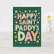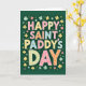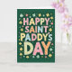 This card features a modern St. Patrick’s Day scene with a deep emerald green background that feels like a cozy night out with friends 💚. Centered in the design, “HAPPY SAINT PADDY’S DAY” is stacked in three lines, filling most of the space like a big toast raised in unison. The rounded letters are thick and softly textured with lighter speckles, giving them a sprinkled, confetti-dusted look. Each word shifts through gentle pastel shades—pink, yellow, blue, orange, and mint—while a thin white outline around every letter helps the message stand out clearly. Around the text, small four-leaf clovers ☘️ and scattered circular dots drift across the background, as if they’re floating between two people leaning close and laughing. The decorations vary in size and spacing, creating a sense of motion like music and chatter in the air. The clovers and dots echo the same pastel colors, with a few tiny shapes tucked near the corners and others sprinkled beside the letters.