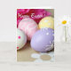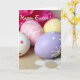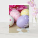 This card shows four pastel decorative eggs gathered close together like friends leaning in for a photo 🐰. In the front, a soft lavender egg is dotted with tiny white spots and small starburst marks, while a gentle pink egg nearby carries a neat zigzag band that feels like a shared secret between them. A creamy white egg stands out with bright fuchsia polka dots, and a sunny yellow egg is finished with small white asterisk shapes that echo the others. The focus stays tight on the shells, giving the scene an intimate, close-up feel, as if you’re right there at the table with them 🌷. In the background, a blurred wash of fuchsia flowers adds a romantic garden touch without stealing attention from the eggs. In the upper-left area, a festive greeting and a short dedication appear in white lettering, floating over the soft background. The eggs sit on a beige surface with subtle texture and thin white floral outlines scattered beneath them.