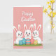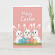 This card shows three white, long-eared bunny friends gathered close in the lower half, their rosy cheeks and wide eyes turned toward one another as they steady a group of decorated eggs with a caring, togetherness-in-the-moment closeness 🐰. The background is a soft blush pink that keeps the scene light and airy, like an early spring morning. Near the upper area, the words “Happy Easter” appear in flowing cursive lettering, set in a darker tone that stands out clearly against the pale backdrop 🌷. Below the bunnies, a deep green strip of grass with gentle texture runs along the bottom edge to suggest an outdoor setting. The eggs bring most of the color: one is bright blue with pink polka dots, another is pale pink with blue stripes, and a third is warm yellow with small blue speckles. Subtle shading and diffused light give the fur and eggs rounded shape, and the bunnies’ soft, attentive expressions feel like a shared secret between close friends. The scene is anchored by the emerald grass band at the base, with the trio and eggs centered above it against the blush field.