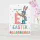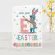 Designed with a crisp white background, this Easter card features a grey-furred bunny in a teal cap and matching trousers, leaning in with a focused, friendly look as if crafting something special for someone close 🐰. The bunny holds a paintbrush with a brown tip and carefully adds white polka dots to a large soft-pink letter “E” near the center. Across the upper and middle area, the phrase “HAPPY HAPPY EASTER” appears in turquoise, with some letters filled solid and others decorated with patterns for extra charm 🌷. Small round dots in teal, orange, and light green float around like confetti, giving the scene a light, social energy. Along the bottom edge, a neat row of oval egg shapes sits side by side, each with its own stripes, dots, and leafy motifs in spring shades. The overall layout feels like a sweet shared project, as though the bunny is finishing the last details before showing it to a friend. The eggs at the bottom include alternating patterns, with one featuring curved stripes and another dotted accents in matching pastel tones. Share your Easter sentiments.