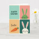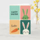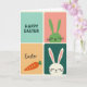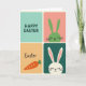 This design shows a 2x2 grid of four rounded-corner panels that feel like a sweet spring snapshot, with soft aquamarine, blush pink, golden apricot, and deep forest green setting a gentle, cozy mood 🌷. In the top-left panel, the words “HAPPY EASTER” sit centered in thick, easy-to-read lettering against an aquamarine background. The top-right panel features a simple green long-eared bunny with closed eyes and fine whiskers on a blush-pink field, as if it’s pausing in calm contentment 🐰. In the bottom-left panel, the word “Easter” appears in flowing handwriting near a tapered orange carrot with leafy green tops, the small texture marks making it feel freshly picked and shared. The bottom-right panel shows a creamy white bunny with pale pink inner ears on a deep forest green background, its relaxed face angled as though it’s quietly keeping the other bunny company. The text is placed within the panels with plenty of open space around it, letting the warm colors and gentle shapes carry a friendly, affectionate tone. The two bunnies are drawn in a minimal style with smooth outlines, one green on pink and the other white on green.