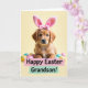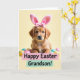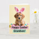This card features a fluffy russet puppy centered on a pale yellow background, looking straight ahead with dark, gentle eyes that feel like a sweet hello. Soft pink upright bunny ears sit on its head, finished with a matching bow that adds a cute holiday touch 🐰. Around the puppy, pastel egg shapes are scattered in soft pink, light blue, sunny yellow, and white, creating a springtime setting that feels warm and friendly. The lighting is soft and even, giving the fur a cozy texture and making the scene feel calm, like a quiet moment shared with someone close. Near the bottom, two brushstroke-style text areas add a note of affection, as if the card is speaking directly to a loved one. “Happy Easter” appears in a rose-pink color, and just beneath it “Grandson!” is written in mint green 🌷. The overall layout keeps the puppy as the main focus while the eggs and text frame it without crowding. The pink bow sits just above the puppy’s forehead, with pastel eggs dotting the space around its paws and lower sides.