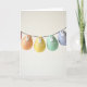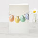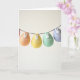 This greeting card features a garland of five pastel, egg-shaped decorations hanging from a thin gray cord that curves in a gentle arc across the upper portion of the design. The background is a very light, airy tone with lots of open space below, making the hanging shapes feel like they’re floating. Each egg shows a different soft color—pale pink at the far left, then warm orange, sunny yellow, mint green, and calm lavender—arranged so the hues feel balanced and friendly 🌷. On top of every egg sits a small white long-eared bunny icon 🐰, and their simple faces give a sweet, affectionate look that reads like a quiet “thinking of you.” Across the front of the eggs, white cursive-style lettering is placed prominently, spelling out “SOME BUNNY LOVES YOU” across the set, with the words split from egg to egg. Soft, diffused lighting keeps the surfaces matte and smooth, while the cord’s slightly woven texture adds a gentle contrast. The cord stretches from left to right near the top third of the card, with the pastel eggs evenly spaced along it.