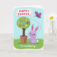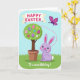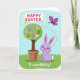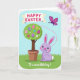 This card features a spring scene with a potted topiary tree at the center, its round green canopy decorated with pastel egg shapes in soft patterns and tiny flower accents 🌷. Beneath the tree, a lavender bunny with long ears, rosy cheeks, and a small pink nose sits on bright green grass, facing slightly upward as if admiring the decorations 🐰. The bunny’s gentle posture and relaxed smile give the scene a friendly, affectionate tone, like it’s waiting to share a sweet moment with someone close. Above the tree, a curved banner stretches across the sky with an Easter greeting in chunky lettering, set in a darker color that stands out against the light background. On the right side, a magenta-and-purple butterfly floats in midair, and a dotted pink trail loops behind it to suggest a light, drifting flight path. Near the bottom edge, a short line of text is placed like a sign-off, printed in a softer color that doesn’t overpower the illustration. The backdrop is a sky-blue field with a soft glow, and the dotted trail curls toward the hovering butterfly beside the decorated topiary.