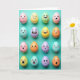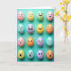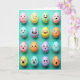 This card shows sixteen egg-shaped faces arranged in a tidy 4x4 grid on a bright teal background, like a little crowd gathered close. Each egg has a soft, matte look and a different pastel shade—pink, yellow, mint, and lavender—so the whole scene feels light and springy 🌷. Simple black outlines form the eyes and mouths, and tiny blush marks add a gentle, affectionate warmth to a few expressions. Some faces beam at their neighbors while others look surprised or thoughtful, creating the sense of quiet friendship and a bit of flirty curiosity passing across the rows. Small shadows under each egg lift them off the surface, giving the layout a subtle 3D presence without getting busy. The greeting appears near the top in a small, neat font in white, with a second line centered near the bottom in a darker teal for contrast 🐰. The final row includes a pale yellow egg with a wide grin, a mint egg with raised brows, a lavender egg with a tiny “o” mouth, and a pink egg with rosy cheeks.
