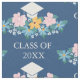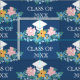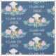 Pretty floral graduation fabric in blue with a white graduation cap above a floral arrangement in pastel pink, blue, and yellow. Personalize with the year in an elegant white font.