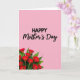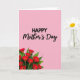 Designed with a soft pastel pink background, this Mother’s Day card keeps the layout simple while still feeling warm and close ❤️. Near the top, the word “HAPPY” sits in large black letters, standing out clearly against the pale backdrop. Just beneath it, “Mother’s Day” appears in a flowing black cursive style, giving the lettering a gentle, affectionate look. The contrast between the strong top word and the softer line below creates a sweet balance, like a steady hug followed by a tender squeeze. In the lower-left corner, a cluster of rich red flowers spreads upward, suggesting a generous bouquet being offered with care 🌼. Each bloom has a golden-yellow center, surrounded by deep green leaves that add depth and a fresh garden feel. The rest of the card stays open and uncluttered, with the pink field stretching wide behind the black text and the upward-sweeping floral cluster.
