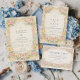 A romantic pastel composition framed in elegant champagne scrollwork and blooming blush, cream, and soft blue florals. Delicate greenery weaves through the ornate baroque border, creating a graceful European-inspired silhouette around the center. The warm ivory background keeps the design light and timeless, while the balanced symmetry adds a refined, heirloom feel. Perfect for couples drawn to classic florals with soft color and sophisticated detail.