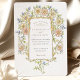 This enchanting Rococo wedding invitation is adorned with delicate pastel florals arranged in an ornate golden frame. The design features an elegant cascade of hand-painted peach, buttercream, and periwinkle blossoms, interwoven with lush green leaves and graceful botanical curves. The frame’s soft watercolor effect brings a romantic, light-filled atmosphere to the invitation.