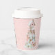 This paper cup design features a trendy pastel gingerbread cookie castle made with 4 layers of cookie houses. Colors include light pink, light blue and light green and tan on a pink background with a white snowflake pattern.