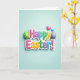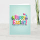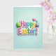 This card shows a pale blue background with a large “Happy Easter!” greeting centered in rounded, puffy letters that look softly raised, like candy shapes. Each letter is a different pastel shade—pink, purple, teal, green, and yellow—with a thin white outline that helps the words stand out. The lighting is gentle, creating small shadows that make the letters feel touchable and cozy. On the left side sits a green egg with neat white polka dots, and on the right is another egg with pink and light-blue stripes. Above the words, two small hearts—one pink and one turquoise—hover close together, like a quiet sign of affection between friends 🌷. The layout feels balanced and friendly, with the message taking the center while the decorations frame it without crowding. “Happy Easter!” is placed in the middle, and the two decorated eggs sit at the lower left and lower right edges of the greeting 🐰.