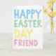 This card features four stacked lines of large, rounded lettering centered on a bright white background, reading “HAPPY,” “EASTER,” “DAY,” and “FRIEND.” Each word sits on its own line with generous spacing, giving the layout an easy, friendly rhythm that feels like a note shared between close pals 🐰. The letters look like they were colored in with crayon or colored pencil, with softly uneven fill and slight texture that suggests a caring hand at work. “HAPPY” appears in a light sky blue, “EASTER” in fresh spring green, “DAY” in sunny yellow, and “FRIEND” in gentle rose pink 🌷. The rounded edges and tiny variations along the outlines add a tender, informal charm, like someone took their time to make it for a favorite person. With no extra illustrations, borders, or background scene, the focus stays on the affectionate message and the bright, springlike colors. The final line, “FRIEND,” sits at the bottom in pink, centered and matching the same thick, textured lettering style as the words above.