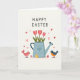This card shows a muted blue watering can holding three pink tulips, their green stems rising with a gentle, caring feel like a small gift between friends 🌷. Near the base of the can, a single golden egg sits quietly, adding a soft seasonal touch. Two stylized birds frame the scene, with a coral-colored bird on the left angled inward as if watching the flowers with tender curiosity. On the right, a bird in layered blues with warm orange accents faces back toward the center, creating the sense of a shared moment between them 🐇. The words “HAPPY EASTER” appear near the top in simple uppercase lettering, set in a darker tone that stands out against the pale background. The overall setting is an off-white field that keeps the focus on the small arrangement and the gentle interaction between the birds. Small pink and red hearts are scattered around the upper area, floating lightly above the watering can and tulips.