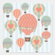 Pastel Hot Air Balloons Rising on Blue Striped Pattern. A pretty and whimsical pastel colored hot air balloon design with many different hot air balloons rising into the sky against a blue striped background.