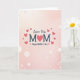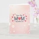 This greeting card features a vertical layout with a soft pink gradient background that fades from very pale at the top to a deeper blush near the bottom. Scattered across the backdrop are many faint, glowing circles in different sizes, like gentle light spots that make the scene feel tender and close ❤️. Centered text reads “Love You” in a flowing dark charcoal-blue style above the large uppercase word “MOM” in the same color. The “O” in “MOM” is replaced by a coral-red heart, giving the main word a sweet, affectionate focal point. Below that, “Happy Mother’s Day” appears in smaller matching lettering, centered and easy to read. Several small coral-red hearts float around the words, as if drifting in the air like little kisses. The overall look balances the calm pink tones with the dark lettering and warm red accents, with hearts sprinkled near the top and sides of the message 🌼.