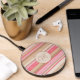This wireless charger has a beautiful yet simplistic pattern of stripes and dots in shades of pink, brown and cream. The monogram letter on the charger is customizable and would make a great personalized gift.