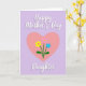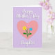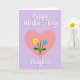 This card features a large soft pink heart centered on a calming lavender background, setting a gentle, affectionate mood ❤️. Inside the heart, three simple flowers rise like a small bouquet, their close grouping suggesting a caring bond. One bloom is sunny yellow, another is pale pink, and the third is light sky blue, each on thin green stems with small leaves. Near the top, the words “Happy Mother’s Day” sit above the heart in white lettering with a faint shadow that helps it stand out. Below the heart, “Daughter” appears in matching white text, centered and spaced to feel balanced with the main artwork. The smooth pastel palette and even lighting keep the edges crisp and the scene soft, like a quiet moment shared between family 👩. The three blossoms are arranged in a slight fan shape, with the yellow flower leaning left, the pink near the middle, and the blue angled to the right.