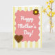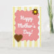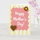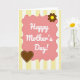 This card features a soft pastel illustration with a large, irregular pink shape in the center, like a gentle cloud or speech bubble, setting a tender tone ❤️. Behind it, the background is filled with alternating vertical stripes in creamy off-white and pale yellow, creating a calm, cozy setting. Across the pink center shape, the text “Happy Mother’s Day!” is placed prominently in flowing white lettering, standing out clearly against the pink. The smooth curves of the lettering and the cushioned center panel give the design a warm, affectionate feel, like a quiet hug between close family. In the upper right, a simple flower emblem adds contrast, with deep brown petals circling a bright yellow center 🌼. In the lower left, a dark brown heart sits with a fine white dashed outline around its edge, like delicate stitching. The overall lighting stays soft and even, with the pink center panel, striped background, flower accent, and stitched heart all clearly defined.