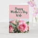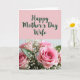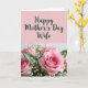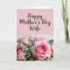The front design shows a soft pastel pink top section with dark green cursive-style lettering that reads “Happy Mother’s Day Wife,” centered and easy to notice. Below the text, a lush bouquet fills the lower portion, with pink roses taking the lead and drawing the eye like a quiet love note ❤️. Small white flowers float between the roses, adding a light, airy touch that feels like a gentle embrace. Deep green leaves frame the blooms, creating contrast and a cozy, close-knit look. The lighting is soft and diffused, smoothing the petals and giving the arrangement a calm, affectionate mood. One central rose sits in sharper focus while the rest fades slightly, like a tender glance shared in the background 🌼. The bouquet’s pinks, whites, and greens sit against a softly blurred backdrop, with the crispest detail on the central rose’s layered petals.