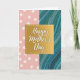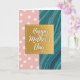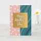 This card features a glowing golden rectangle in the center, edged with a tiny dotted white border that makes it look like a wrapped gift. Inside the gold panel, flowing white lettering sits prominently with a faint shadow, giving the message a soft lift from the background. The backdrop is split straight down the middle, with a gentle pastel pink field on the left covered in irregular white polka dots that feel like little confetti for a sweet moment ❤️. On the right, swirling marbled bands of blue, teal, and green curl together like moving water, adding depth and a quiet sense of closeness. The contrast between the airy dots and the smooth swirls sets up a friendly, romantic balance, like two different personalities leaning toward each other. The main text stays centered within the gold panel, while the dotted border frames it evenly on all sides, keeping the focus right where your eyes land 🌼. The left half is pink with scattered white dots, and the right half is a blue‑teal‑green marbled pattern behind the central golden panel.