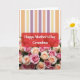 This design shows a modern mix of soft geometry up top and a lush bed of roses below, creating a cozy, affectionate mood ❤️. Across the upper section, slim vertical stripes alternate between pale yellow, light peach, gentle lavender, and white, like a tidy backdrop behind the flowers. The lower area is filled with tightly layered roses in fuchsia, blush pink, creamy apricot, and ivory, their curled petals leaning into one another as if sharing a quiet closeness. The lighting is soft and even, giving the blooms a fresh look and a subtle glow along the petal edges. Centered over the flowers sits a rounded red banner that feels like a warm embrace across the middle of the card. On the banner, the message appears in white serif lettering, standing out clearly against the red, with the text centered and easy to read 🌼. The contrast between the orderly stripes and the overflowing roses makes the middle message area feel gently highlighted. The banner’s corners are smoothly curved, and the roses beneath it show layered petals with darker centers fading to lighter outer edges.