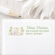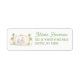 This return address label design has a pastel color palette and features a nativity scene with baby Jesus in a manger. You can add your name and return address.